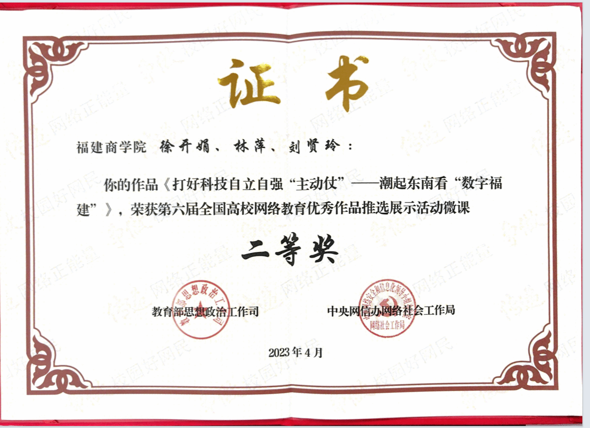 澳门网投官网徐开娟老师的作品《打好科技自立自强“主动仗”-----潮起东南看“数字福建”》,荣获第六届全国高校网络教育优秀作品推选展示活动微课二等奖。