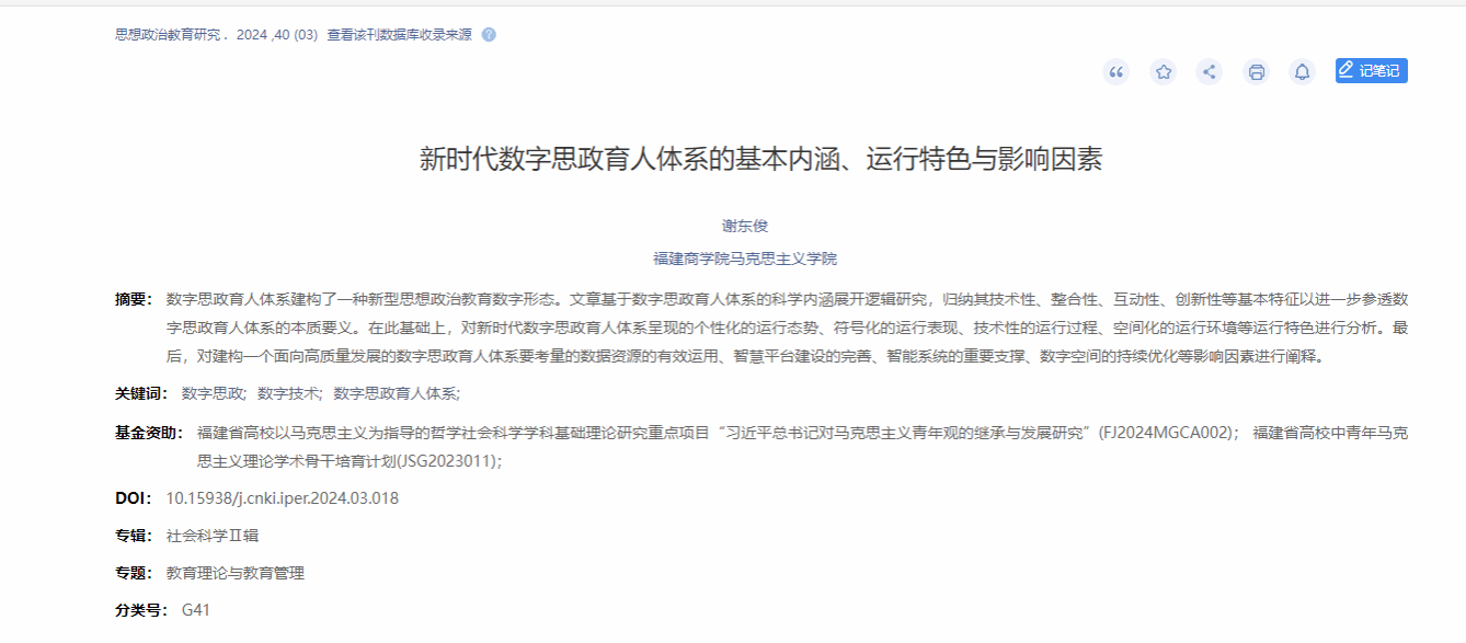 近日,澳门网投官网谢东俊副院长在北大核心期刊《思想政治教育研究》发表文章《新时代数字思政育人体系的基本内涵、运行特色与影响因素》
