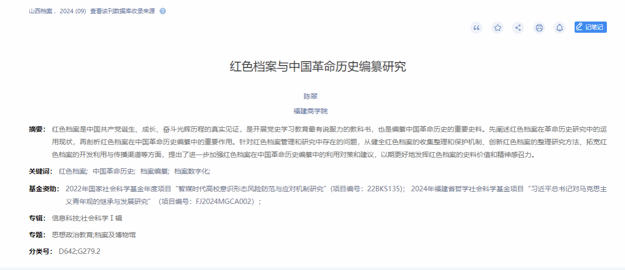 近日,澳门网投官网陈翠教师在北大核心期刊《山西档案》发表文章《红色档案与中国革命历史编纂研究》。