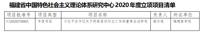 近日,中共福建省委宣传部公布了福建省中国特色社会主义理论体系研究中心2020年立项项目清单。澳门网投官方网站谢东俊老师主持申报的《习近平总书记关于网络意识形态工作的重要论述研究》(项目编号:FJ2020ZTB005)被遴选为福建省中国特色社会主义理论体系研究中心年度项目。