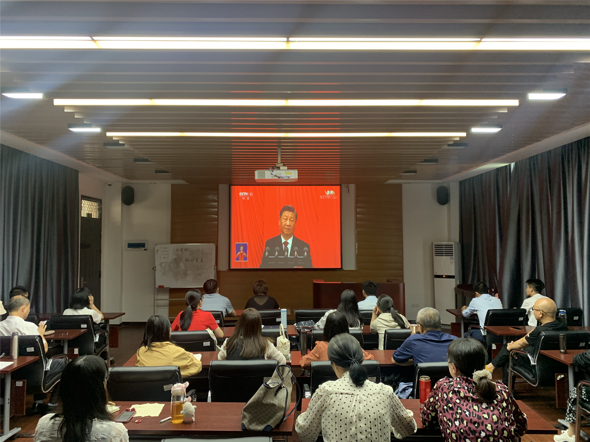 上午10时,党的二十大开幕会直播开始,习近平总书记代表第十九届中央委员会向大会作报告。在收听的报告过程中,全体教师认真聆听,全神贯注,边看边记,并不时响起热烈的掌声回应习近平总书记的精彩报告。