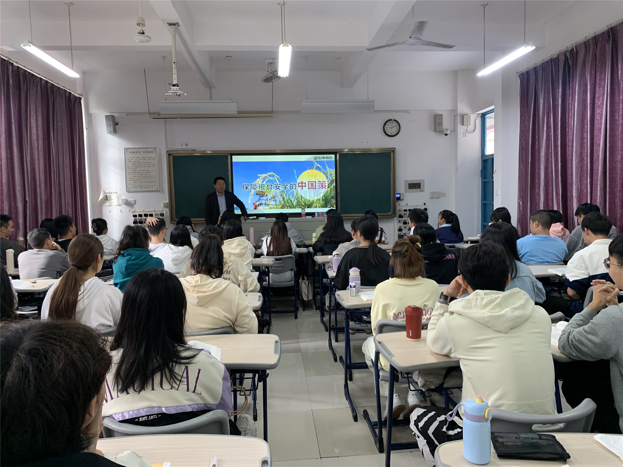 杨晓翔副校长授课深入浅出,课堂气氛活跃,特别是他能结合自己丰富的人生阅历融入课堂,让学生感同身受,深受同学们的喜欢,学生纷纷表示听完这堂思政课后受益匪浅,对“保障粮食安全”有了更全面更深刻的认知。