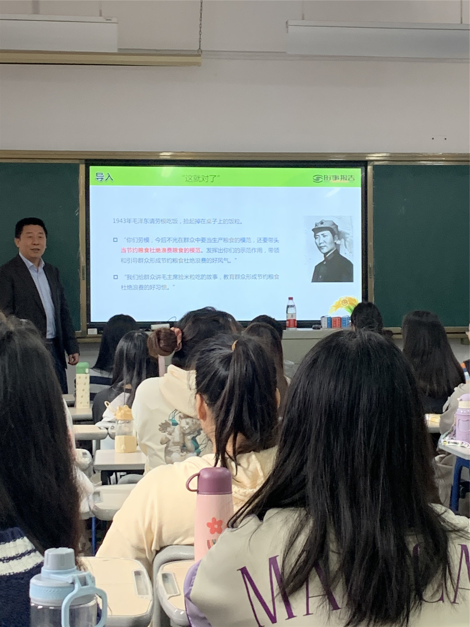 杨晓翔副校长以“世界什么问题最大?““谁来养活中国?”等问题导入主题,阐明了马克思主义经典作家毛泽东、习近平等关于粮食安全问题的重要论述。他以翔实的数据、丰富的素材,阐述了我国保障粮食安全的重要策略:一要自力更生,形势持续向好;二要认清现状,不能轻言过关;三要系统推进,端牢中国饭碗。杨副校长以问题为导向,运用案例分析法讲授,既有图文解说,又注重学理分析,引导学生明确“国以民为本、民以食为天”的重要性,并嘱咐学生要弘扬勤俭节约之风,让勤俭节约内化于心、外化于行。