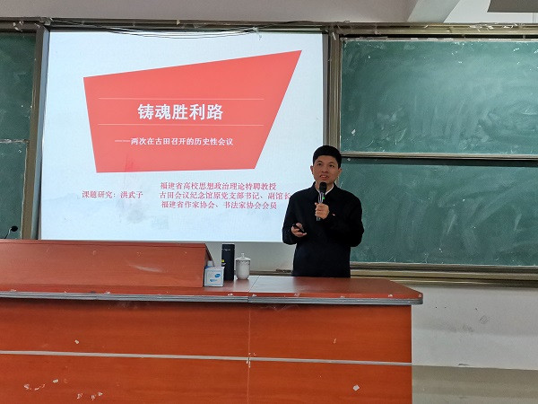 为深入学习贯彻习近平总书记关于学校党建和思政工作的重要指示批示精神,推动学校师生深入学好党史、新中国史、改革开放史、社会主义发展史,12月8日,古田会议纪念馆原副馆长、福建省高校思想政治理论课特聘教授洪武子莅临澳门网投官网开展题为《铸魂胜利路——两次在古田召开的历史性会议》讲座。校党委副书记吴访益和学工部、澳门网投官方网站部分教师以及校习近平新时代中国特色社会主义思想读书社社员共130多人聆听此次讲座。