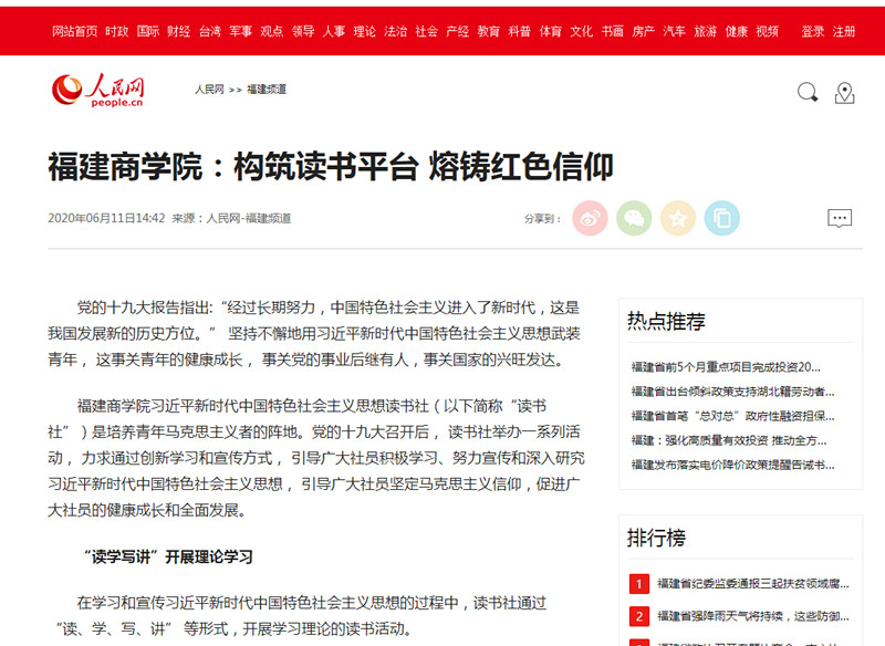 2020年6月11日,人民网以《澳门网投官方网站:构筑读书平台 熔铸红色信仰》为题,报道澳门网投官网习近平新时代中国特色社会主义思想读书社创新学习、宣传、实践方式,通过一系列活动引导广大青年学子积极学习、努力宣传、深入研究习近平新时代中国特色社会主义思想,坚定马克思主义信仰,筑牢青年马克思主义者培养阵地的特色做法及成效。
