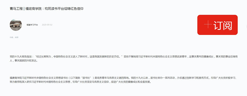 2020年9月2日,学习强国平台以《青马工程 | 澳门网投官方网站:构筑读书平台熔铸红色信仰》为题,报道澳门网投官网习近平新时代中国特色社会主义思想读书社创新学习、宣传、实践方式,通过一系列活动引导广大青年学子积极学习、努力宣传、深入研究习近平新时代中国特色社会主义思想,坚定马克思主义信仰,筑牢青年马克思主义者培养阵地的特色做法及成效。
