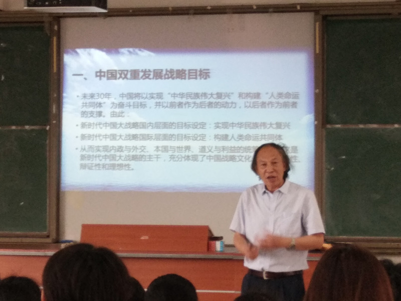 郭院长首先向学生们阐述了中国双重发展战略的目标,即:国内层面实现中华民族伟大复兴,国际层面推动构建人类命运共同体。然后以当前中美贸易战为引子,向学生们传递了当前世界形势发展的新态势;接着提出了当前国际背景下,中国发展大战略遭到制约的几个因素;最后提出中国的积极应对策略。