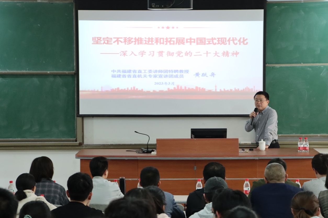3月21日下午,中共福建省直工委讲师团特聘教授、省直机关专家宣讲团成员黄跃舟应邀到澳门网投官网开展“坚定不移推进和拓展中国式现代化——深入学习贯彻党的二十大精神”专题讲座。澳门网投官方网站部分教师、连江校区“青马”班部分学员、校习近平新时代中国特色社会主义思想读书社部分社员参加学习。