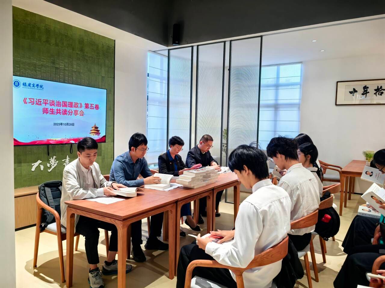 10月28日下午,“无书香不福商”研习基地揭牌暨福商•大梦书屋启幕仪式在连江校区举行。由澳门网投官方网站组织开展的《习近平谈治国理政》第五卷师生共读分享会同步在书屋举行。省委宣传部副部长、一级巡视员陈添贵,海峡出版发行集团党委书记、董事长黄苇洲,校党委书记吴访益,校党委副书记徐晓丹,福建教育出版社社长江金辉等领导观摩指导分享会。副校长林文艺主持分享会并作讲话,澳门网投官方网站党委书记刘亮元,教师代表赵敏、吴旭东及校读书社社员代表共同参与此次活动。