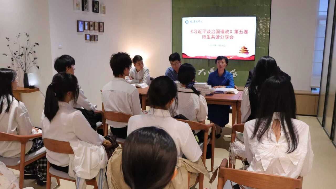 在活动中,社员代表林安琪、刘煜阳、张露丹、李一蓉、于福佳、陶天伊等同学先后分享了深学细悟第五卷的心得体会。同学们结合自身学习生活实际,畅谈对书中观点的理解与感悟。有的同学聚焦书中关于推动高质量发展的论述,提出作为新时代青年,应努力学习专业知识,提升自身能力,为将来投身国家建设贡献力量;有的同学从以人民为中心的发展思想出发,表示要在日常生活中关心同学、服务社会,践行为人民服务的宗旨。教师代表赵敏、吴旭东也分别就第五卷中的“发展新时代中国特色社会主义文化”“扎实推进‘一国两制’实践和祖国统一大业”专题进行研读感悟分享。