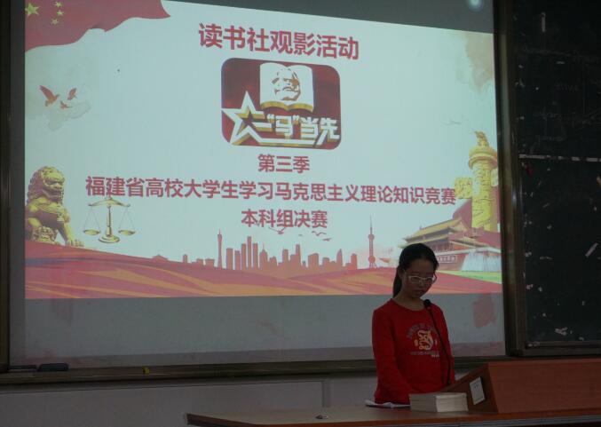 据悉,读书社积极响应《中共福建省委教育工委办公室关于组织收看第三季全省高校大学生学习马克思主义理论“一‘马’当先”知识竞赛实况录像的通知》文件精神,此前,已于3月18日在全体干部干事会议上率先组织观影,力求通过精心组织,广泛发动,创造条件,把学习马克思主义理论作为重要内容,在全社范围积极营造大学生学习马克思主义理论的浓厚氛围。同学们表示,通过收看“一‘马’当先”知识竞赛,一定程度上加深了对该赛事的了解,掌握了学习马克思主义理论的经验方法,特别为澳门网投官网前几季参赛选手所鼓舞并将以他们为榜样,在未来的日子里将激昂斗志,不断提升自己,争取有朝一日为学校的建设添砖加瓦、为集体的荣誉贡献力量!