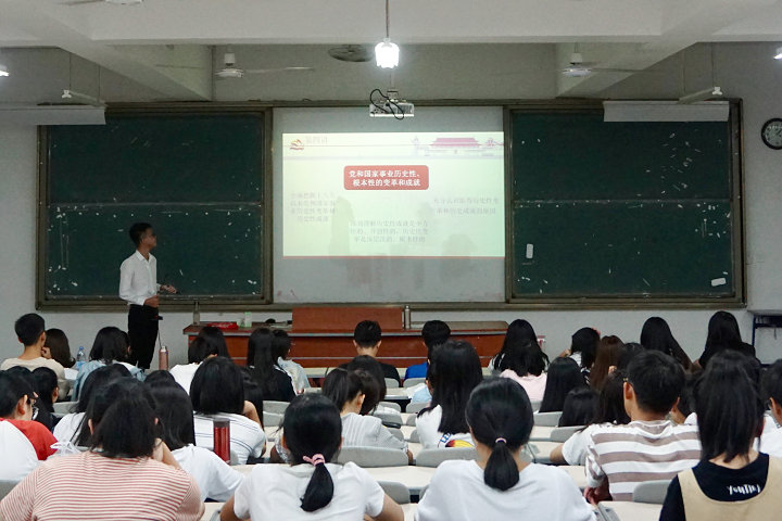 9月26日晚,澳门网投官网习近平新时代中国特色社会主义思想读书社在连江校区诚信楼大阶一教室开展第二场学生小分队“大宣讲”活动。本次宣讲以“《习近平新时代中国特色社会主义思想三十讲》导读”为主题,由读书社理论骨干宣讲小分队成员、福建省第二季大学生学习马克思主义理论知识竞赛本科组冠军苏金楼同学面向管理工程系2018级会展经济与管理专业的新生进行宣讲。