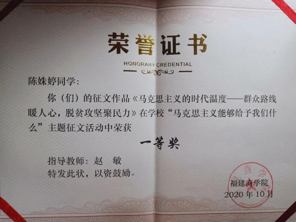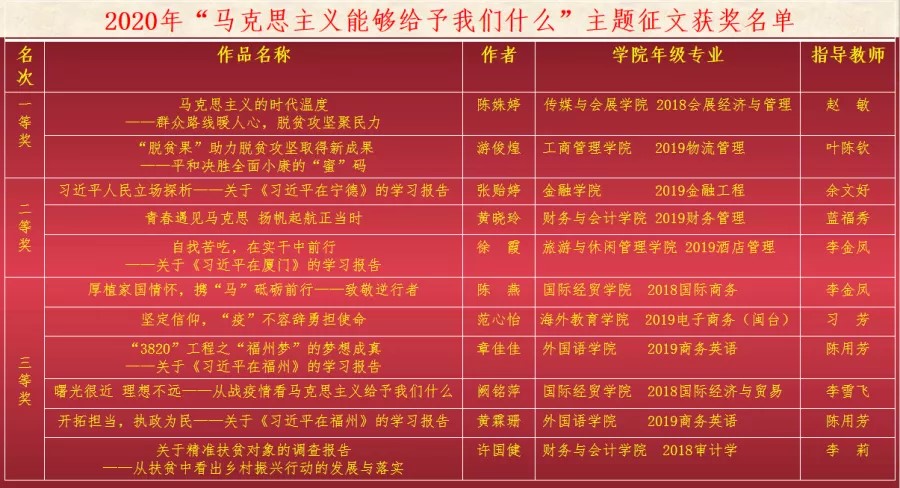 活动自2020年6月开展以来,各学院积极组织学生撰写,至截稿日期,共收到参赛征文80余篇,学生工作部、澳门网投官方网站等部门组织开展初选、复选,推出11篇参加决赛,经校外专家评审,最终评出一等奖2名,二等奖3名,三等奖6名。其中,推荐前五名参加“马克思主义能够给予我们什么”—第四届福建省高校大学生主题征文和微演讲活动。具体获奖名单如下: